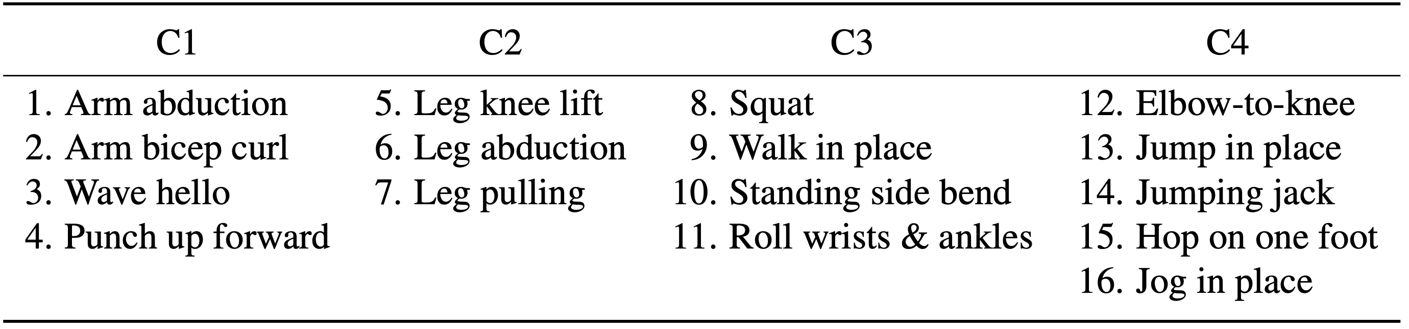 Table 1. The 16 actions in our SPHP dataset are categorized into four classes: C1 for upperbody movements, C2 for lower-body movements, C3 for slow whole-body movements, and C4 for fast whole-body movements.