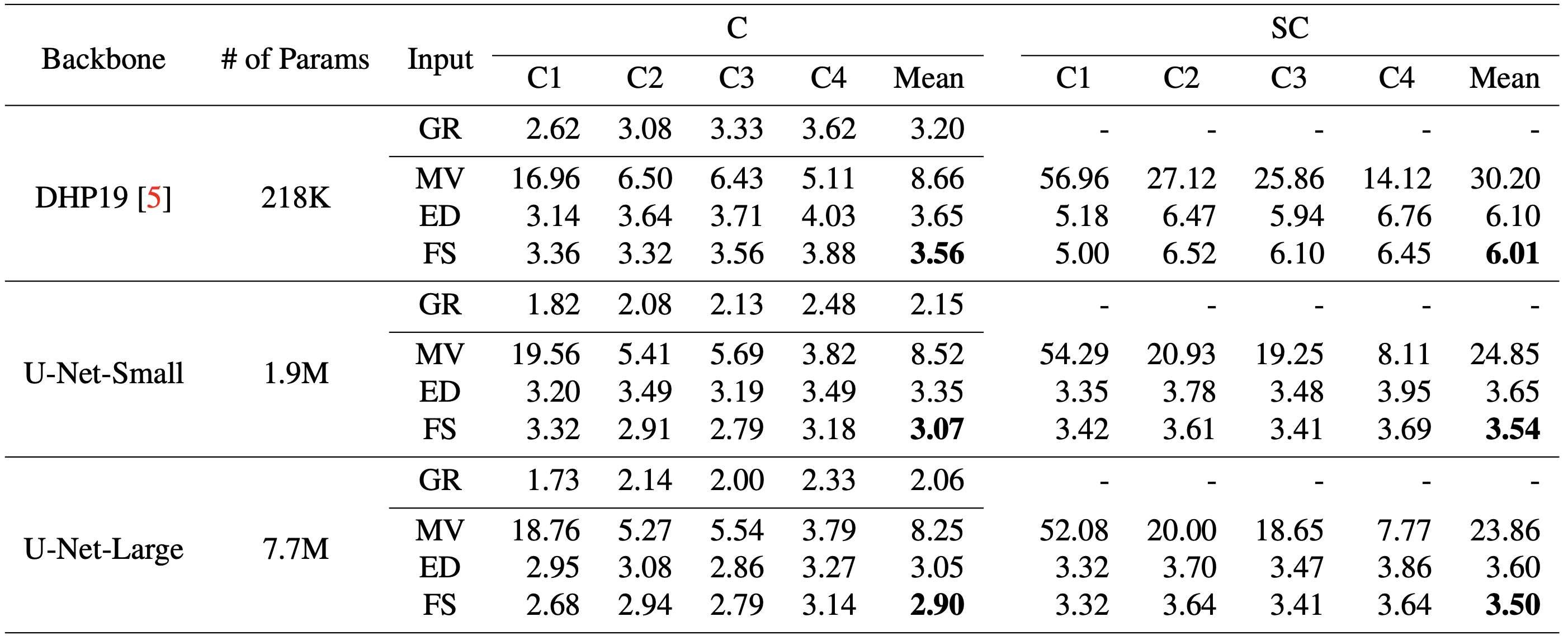 Table 2. MPJPE (lower is better) on SPHP with different input types. Different input modalities, "GR", "ED", "MV", and "FS", are grayscale, edge, motion vector, and fusion (edge and motion vector), respectivetly. C1, C2, C3, C4 are four classes listed in Table 1. C and SC are traditional and sparse convolutions, respectively.